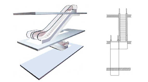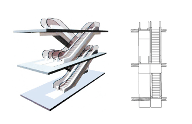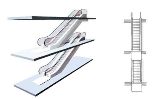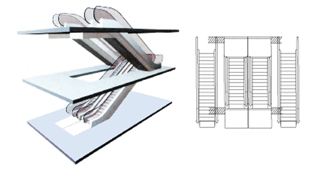 Such arrangement covers small space with flexible escalator position. It can only fulfill one-way intermittent passenger flow. It is most applicable for small shopping center and supermarket.