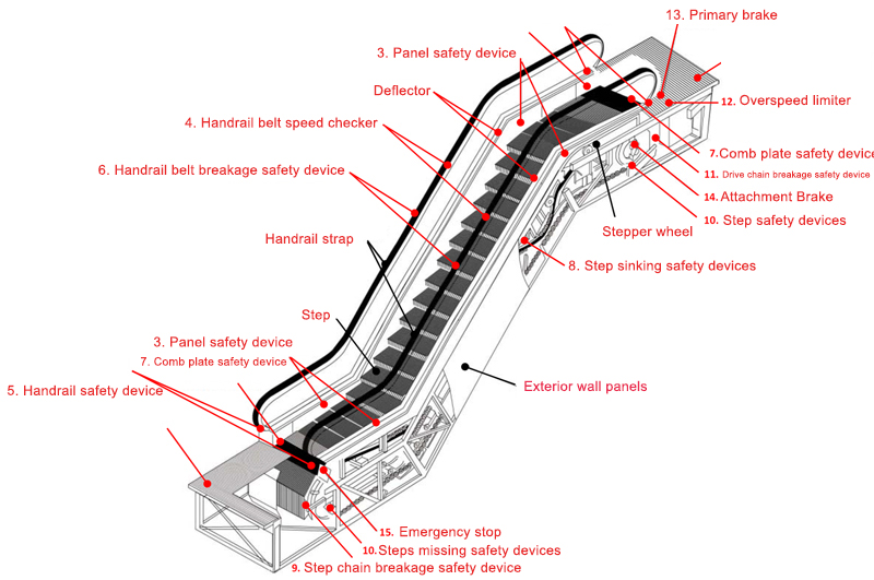 Such an arrangement is mainly applicable for large shopping centers and public traffic occasions with large passenger flow. If passenger flow has one-way rush hours, it can adjust the running direction of the partial escalator to meet passenger flows at rush hours.